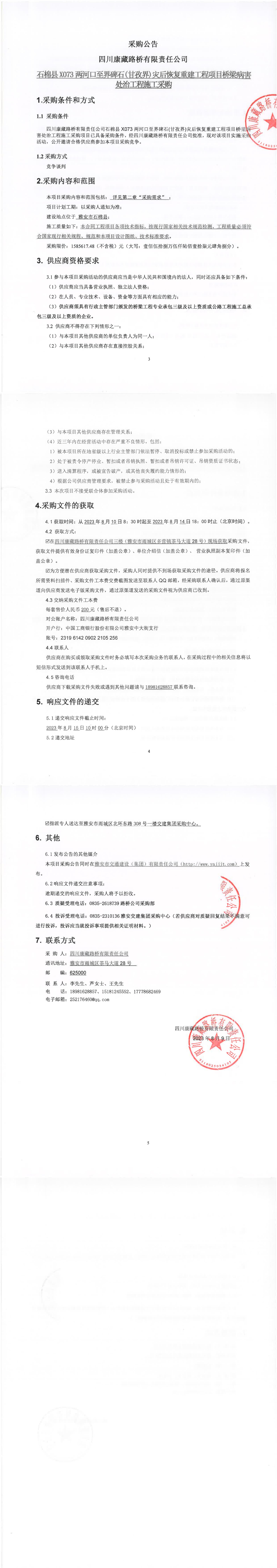 四川康藏路桥有限责任公司石棉县X073两河口至界碑石(甘孜界)灾后恢复重建工程项目桥梁病害处治工程施工采购