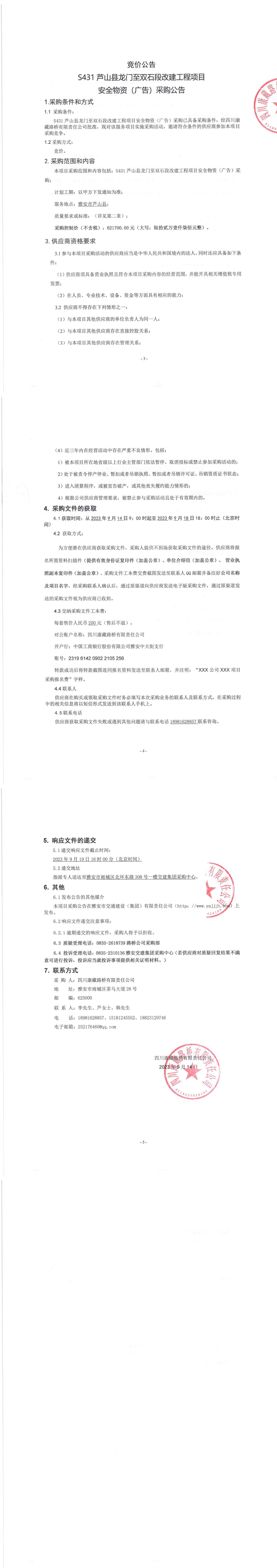 四川康藏路桥有限责任公司S431芦山县龙门至双石段改建工程项目安全物资(广告)采购公告