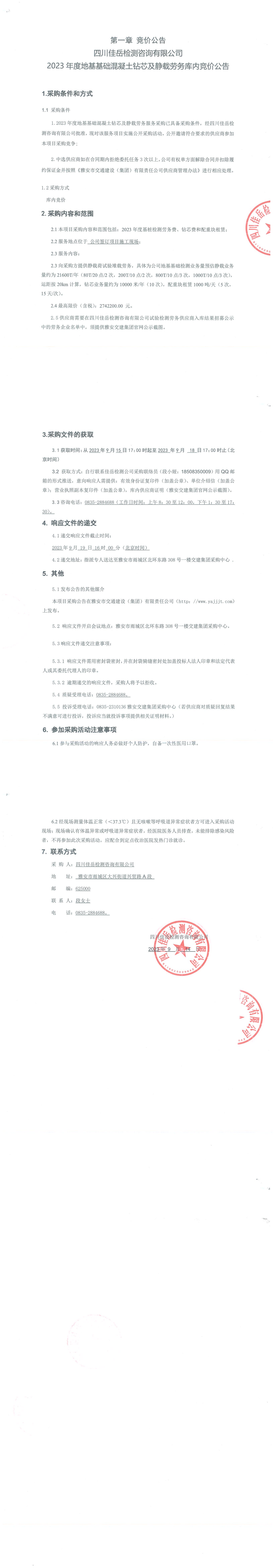 四川佳岳检测咨询有限公司2023年度地基基础混凝土钻芯及静载劳务库内竞价公告
