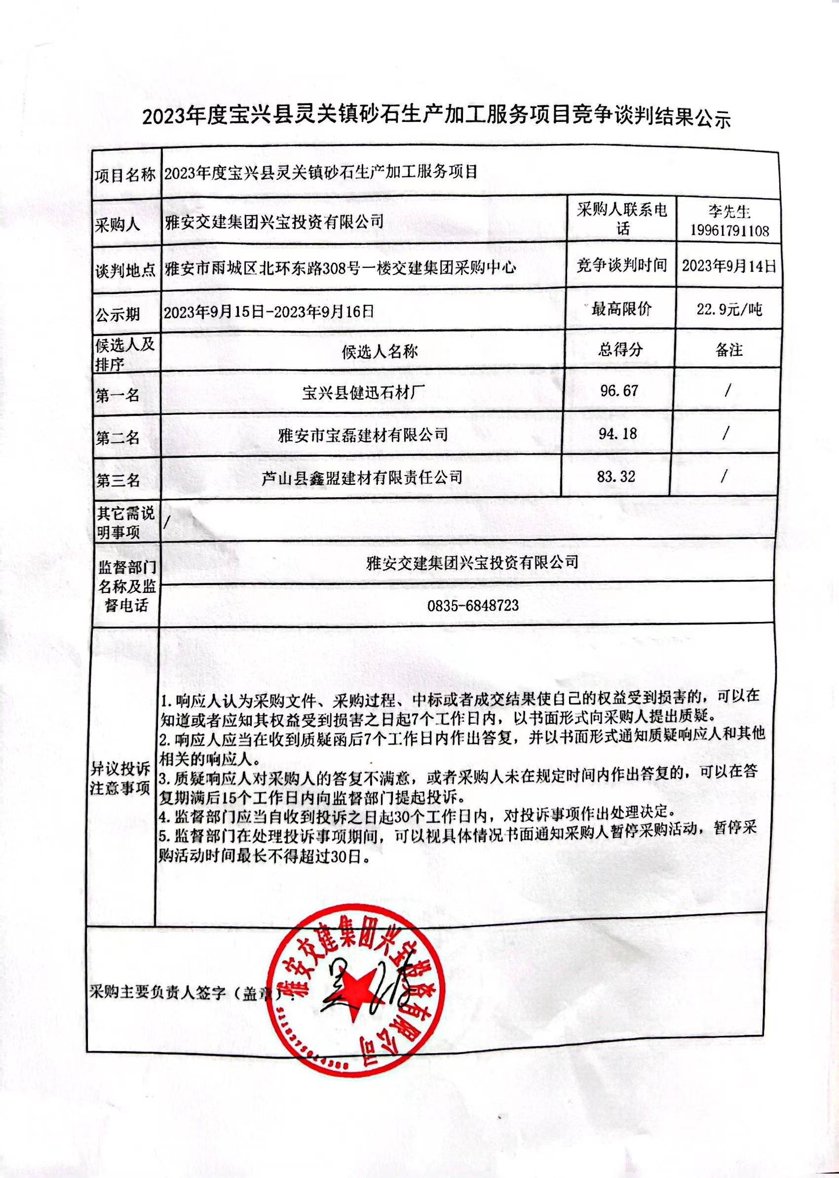 米兰体育-米兰(中国)官网 兴宝投资有限公司2023年度宝兴县灵关镇砂石生产加工服务项目竞争谈判结果公示