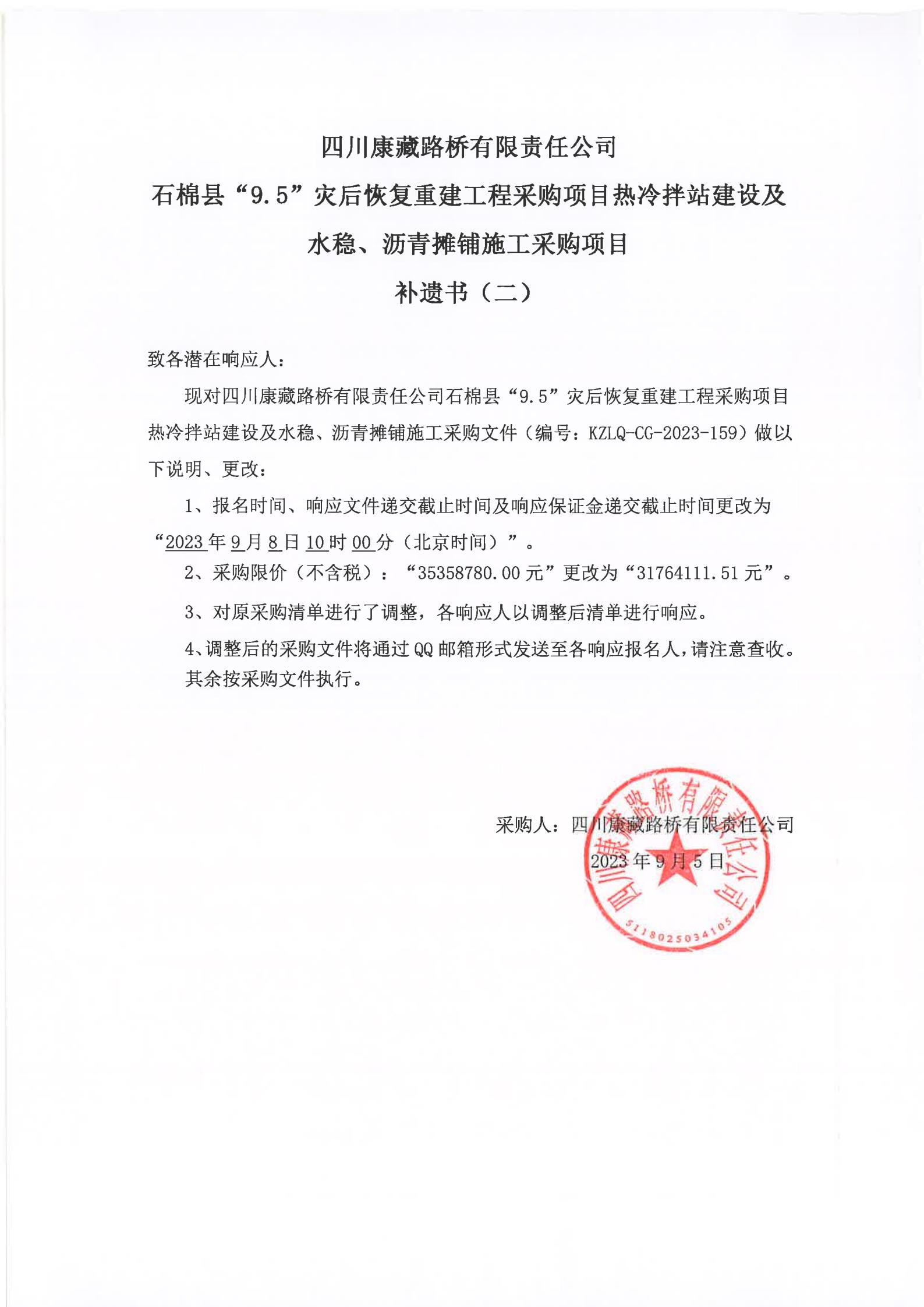 四川康藏路桥有限责任公司石棉县“9·5”灾后恢复重建工程采购项目热冷拌站建设及水稳、沥青摊铺施工采购项目补遗书(二)