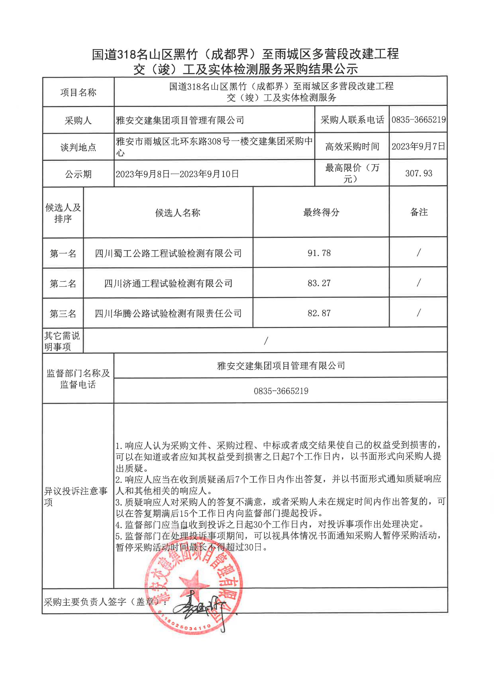 米兰体育-米兰(中国)官网 项目管理有限公司国道318名山区黑竹(成都界)至雨城区多营段改建工程交(竣)工及实体检测服务采购结果公示