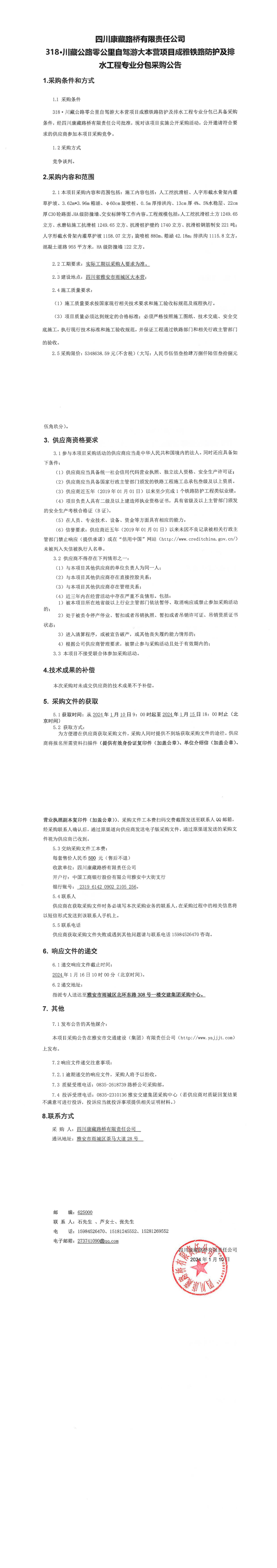 四川康藏路桥有限责任公司318·川藏公路零公里自驾游大本营项目成雅铁路防护及排水工程专业分包采购公告