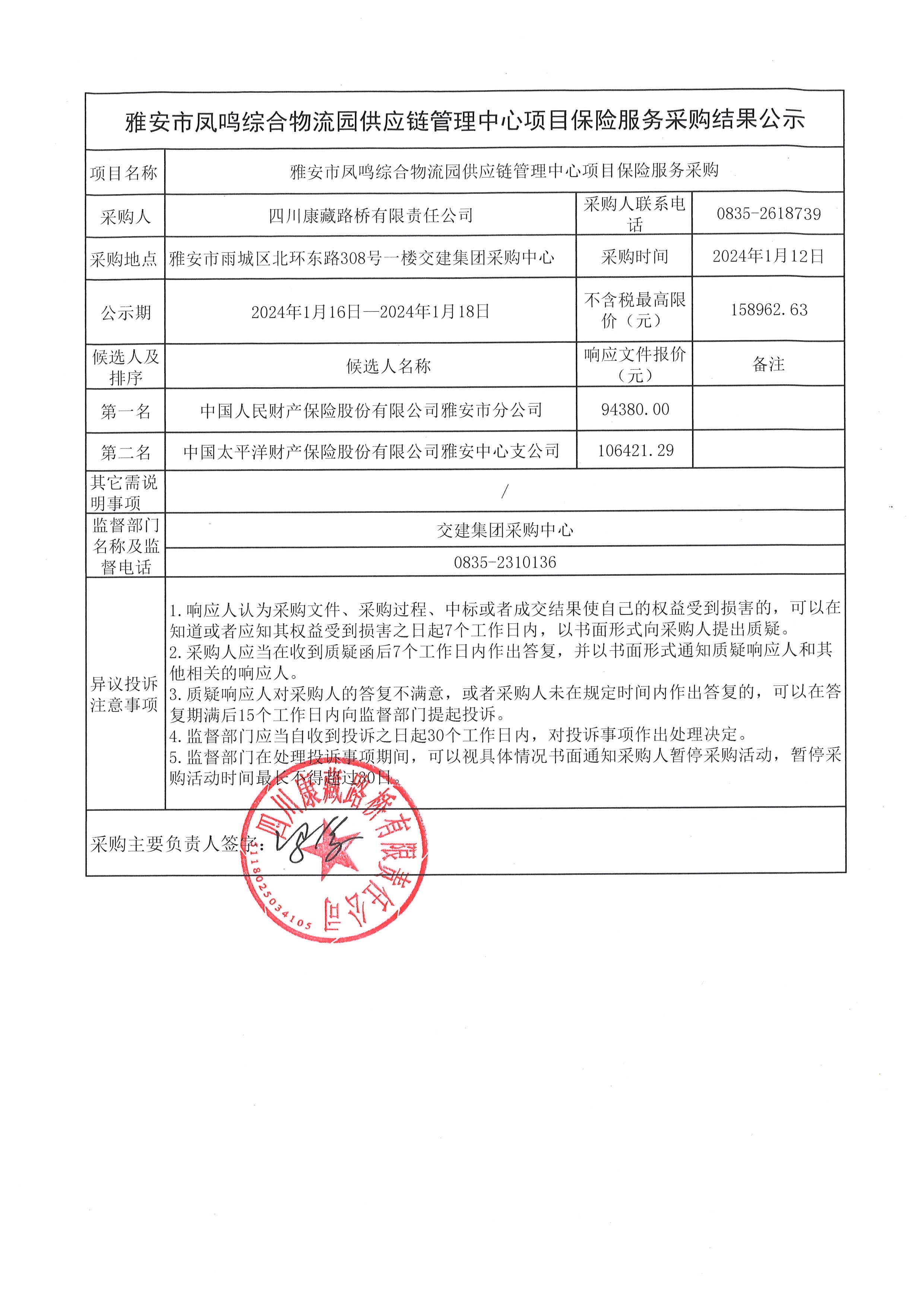 四川康藏路桥有限责任公司雅安市凤鸣综合物流园供应链管理中心项目保险服务采购结果公示