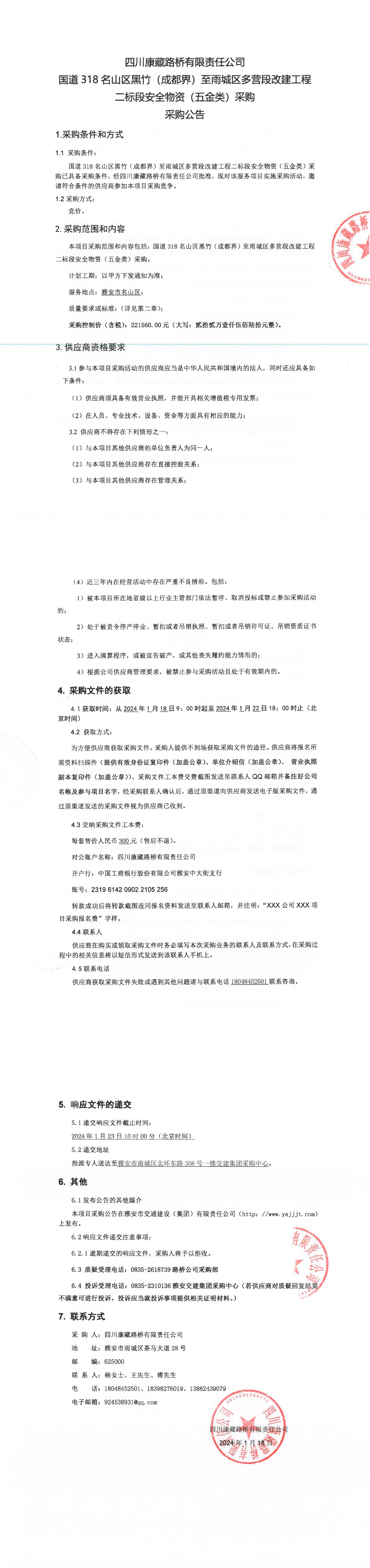 四川康藏路桥有限责任公司国道318名山区黑竹(成都界)至名山区多营段改建工程二标段安全物资(五金类)采购公告