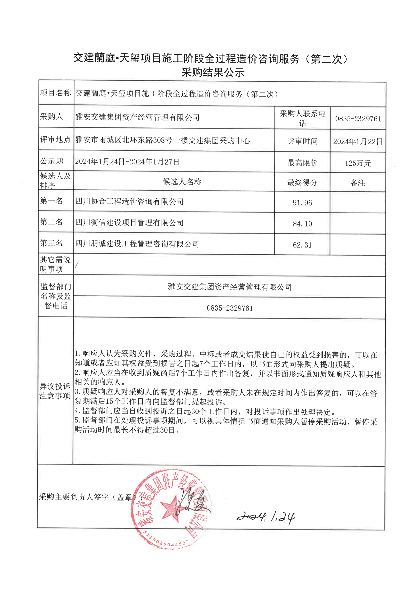 米兰体育-米兰(中国)官网 资产经营管理有限公司交建蘭庭·天玺项目施工阶段全过程造价咨询服务(第二次)采购结果公示