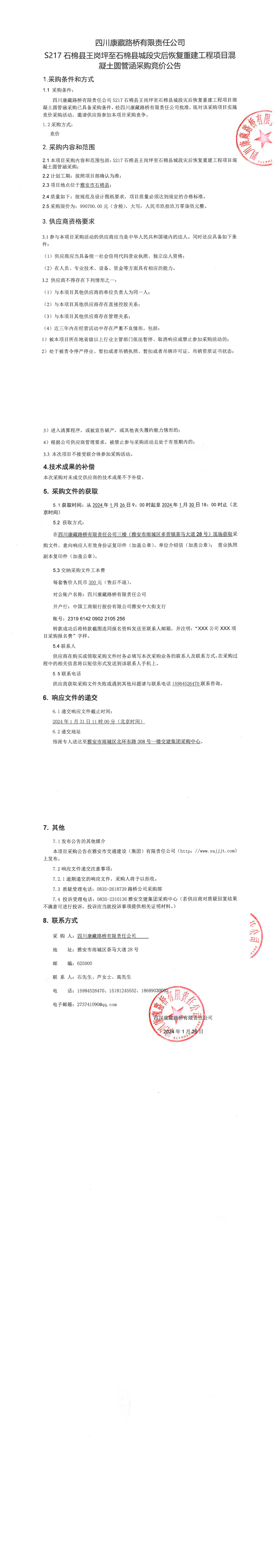 四川康藏路桥有限责任公司S217石棉县王岗坪至石棉县城段灾后恢复重建工程项目混凝土圆管涵采购竞价公告