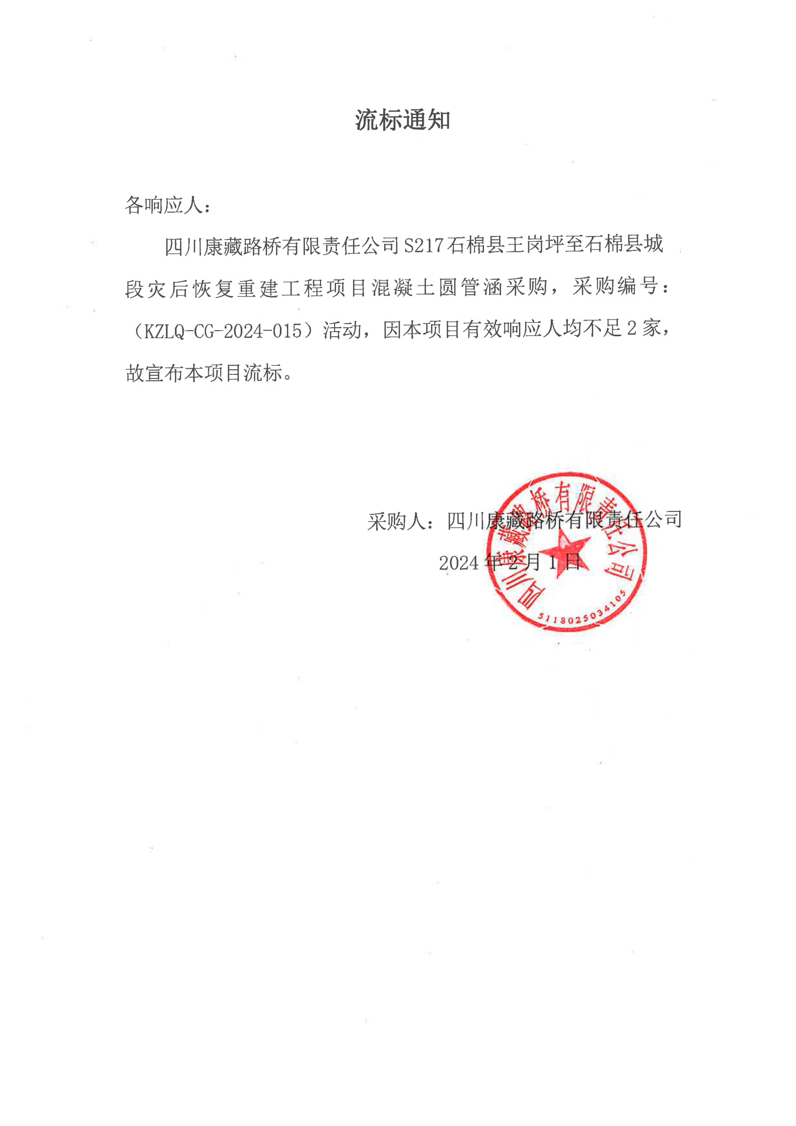 四川康藏路桥有限责任公司S217石棉县王岗坪至石棉县城段灾后恢复重建工程项目混凝土圆管涵采购流标通知