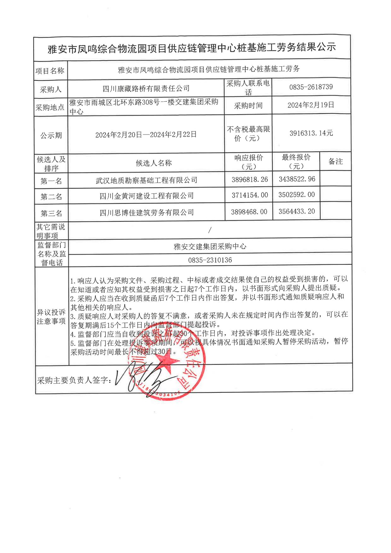 四川康藏路桥有限责任公司雅安市凤鸣综合物流园项目供应链管理中心桩基施工劳务结果公示