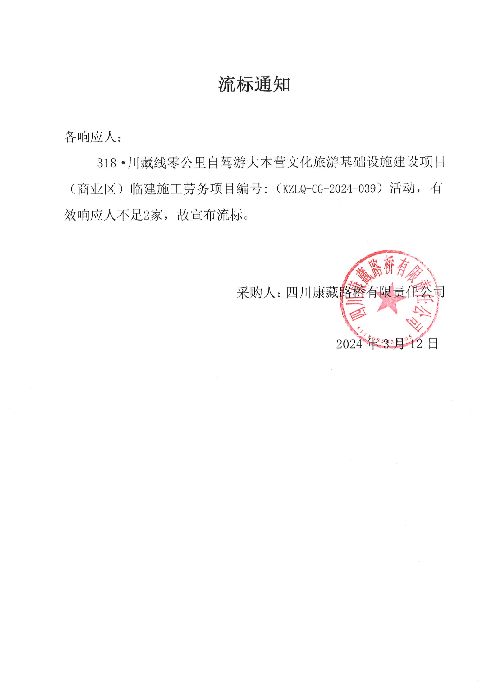 四川康藏路桥有限责任公司318·川藏线零公里自驾游大本营文化旅游基础设施建设项目(商业区)临建施工劳务流标通知