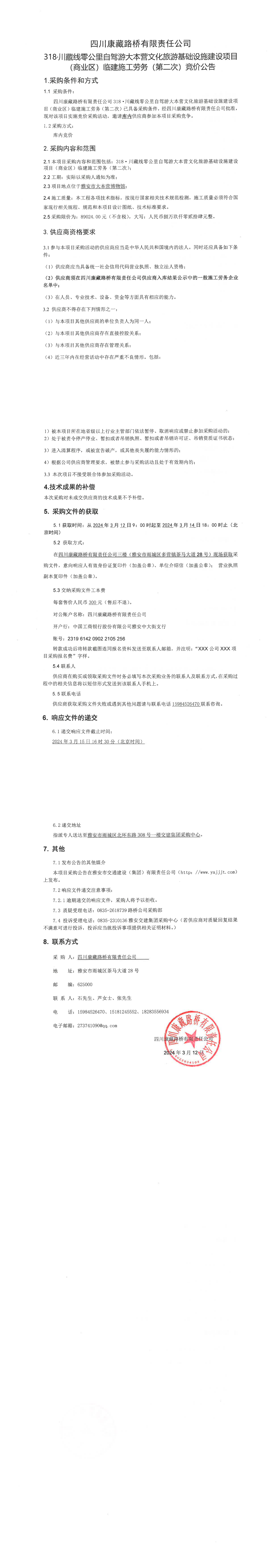 四川康藏路桥有限责任公司318·川藏公路零公里自驾游大本营文化旅游基础设施建设项目(商业区)临建施工劳务(第二次)竞价公告