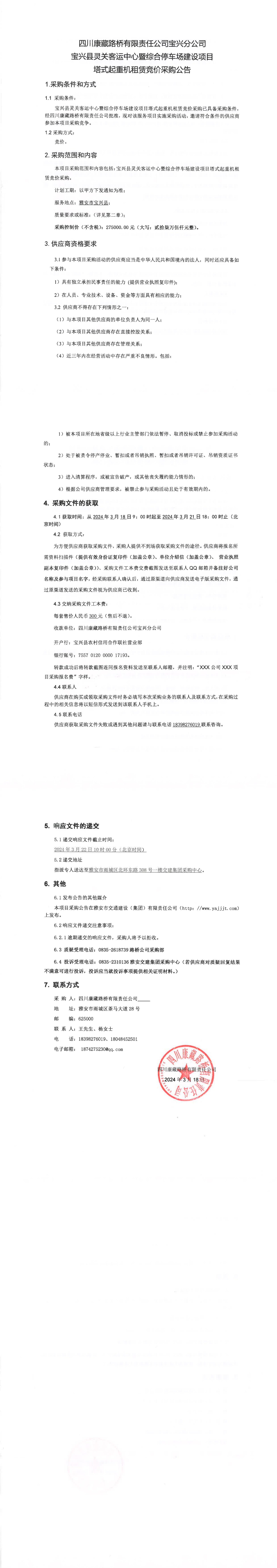 四川康藏路桥有限责任公司宝兴县灵关客运中心暨综合停车场建设项目塔式起重机租赁竞价采购公告