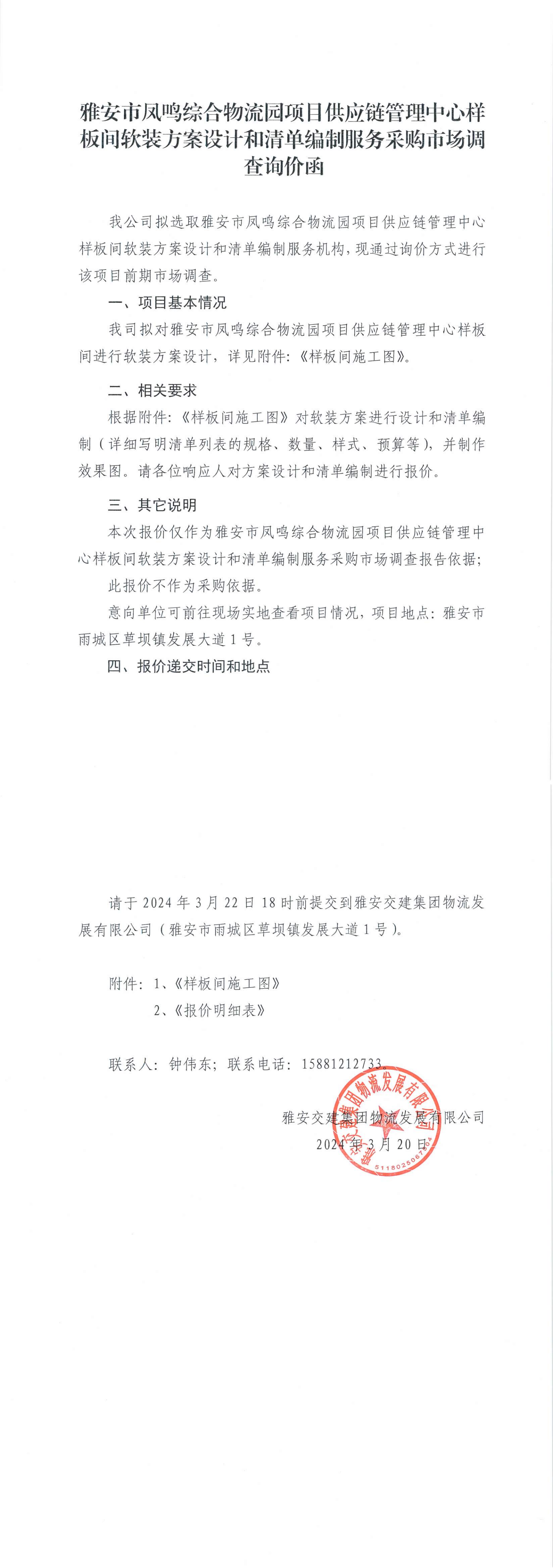 米兰体育-米兰(中国)官网 物流发展有限公司雅安市凤鸣综合物流园项目供应链管理中心样板间软装方案设计和清单编制服务采购市场调查询价函