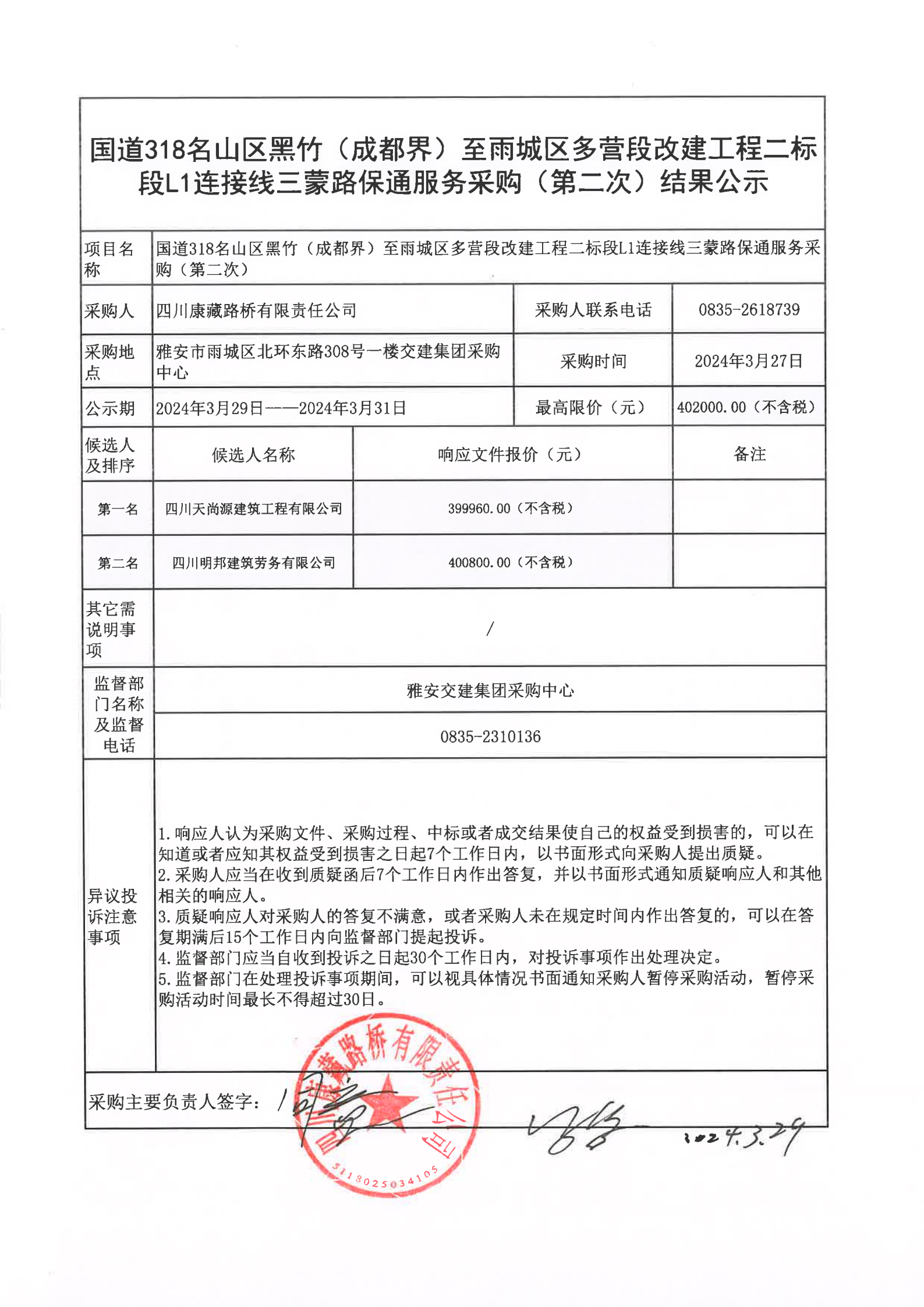 四川康藏路桥有限责任公司国道318名山区黑竹(成都界)至雨城区多营段改建工程二标段L1连接线三蒙路保通服务(第二次)结果公示
