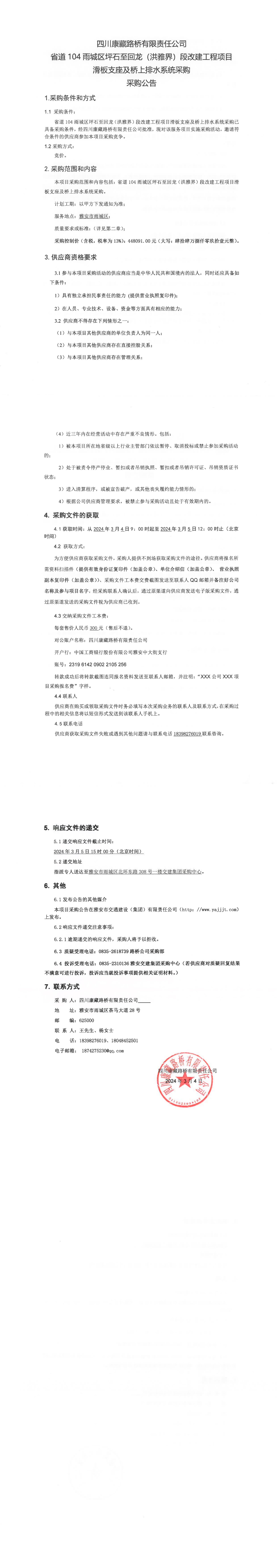 四川康藏路桥有限责任公司省道104雨城区坪石至回龙(洪雅界)段改建工程项目滑板支座及桥上排水系统采购公告