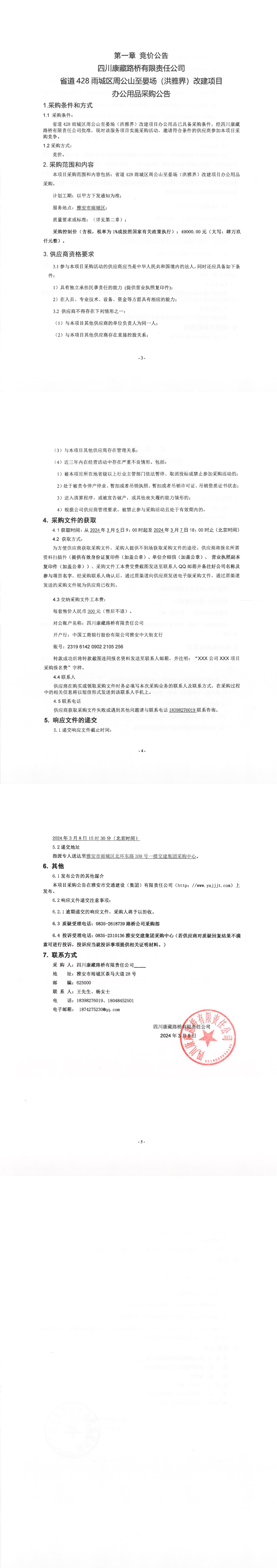 四川康藏路桥有限责任公司省道428雨城区周公山至晏场(洪雅界)改建项目办公用品采购公告