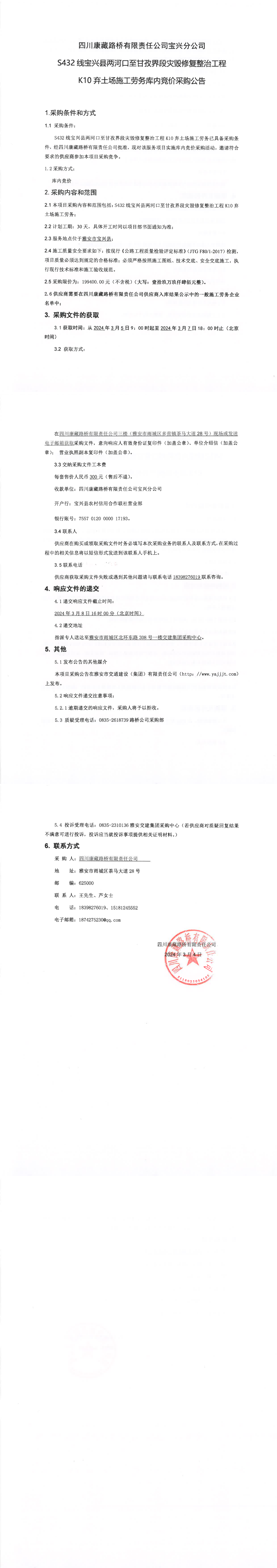 四川康藏路桥有限责任公司S432线宝兴县两河口至甘孜界段灾毁修复整治工程K10弃土场施工劳务库内竞价采购公告