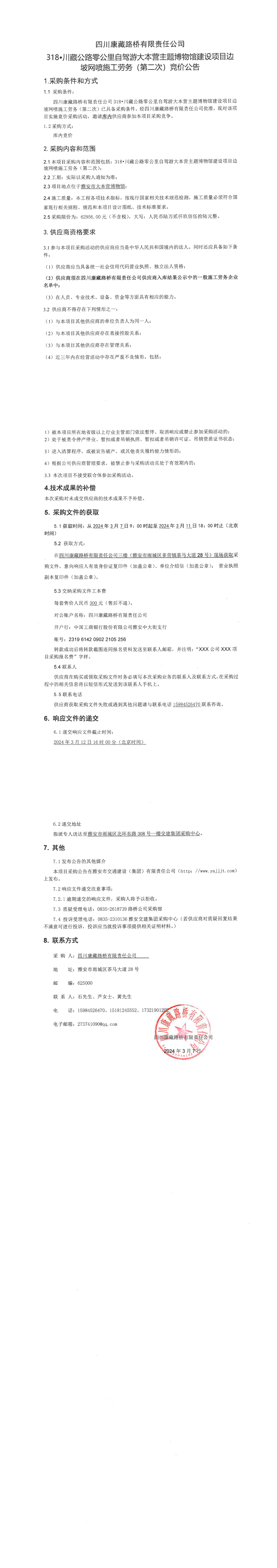 四川康藏路桥有限责任公司318·川藏公路零公里自驾游大本营主题博物馆建设项目边坡网喷施工劳务(第二次)竞价公告