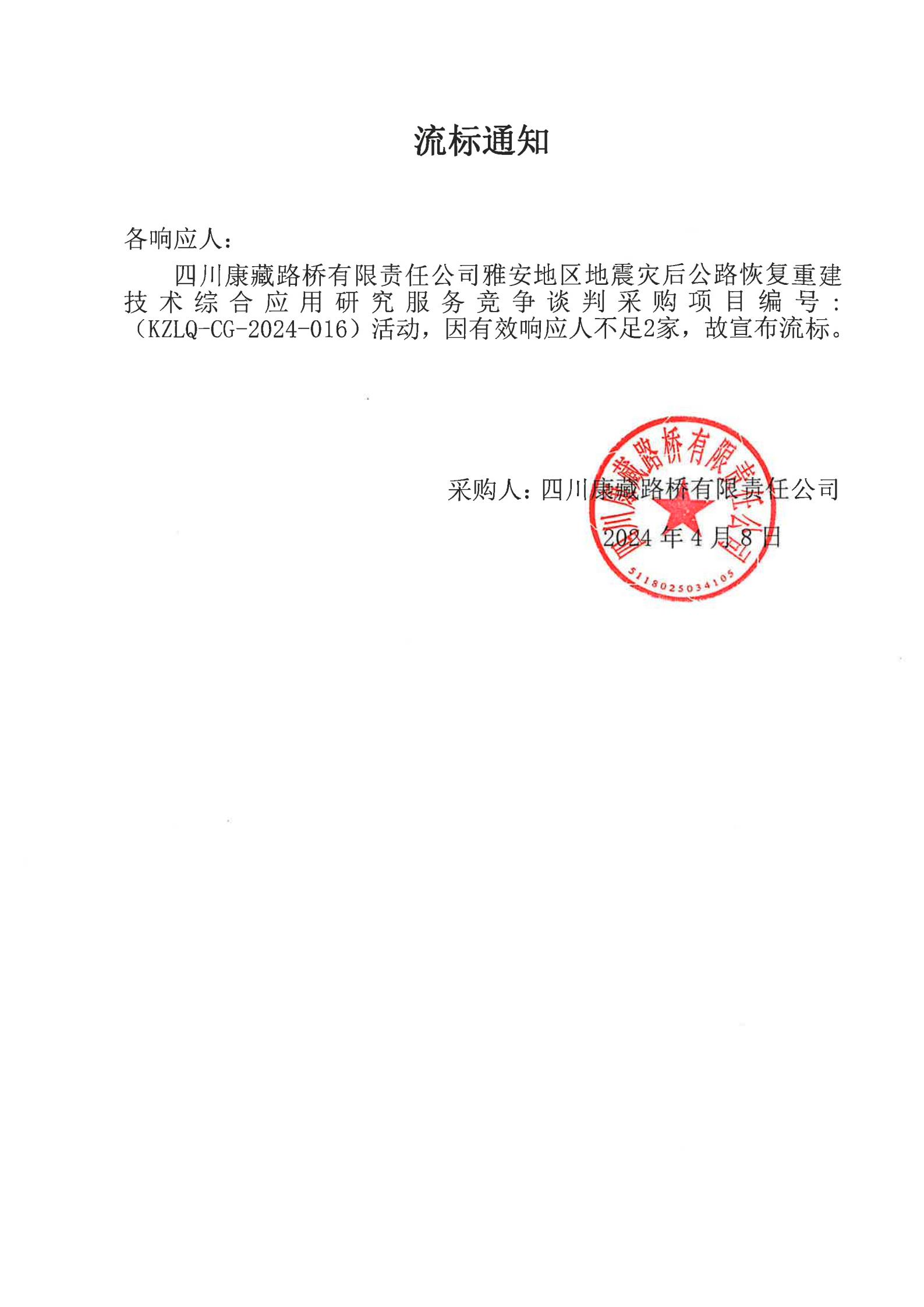 四川康藏路桥有限责任公司雅安地区地震灾后公路恢复重建技术综合应用研究服务流标通知