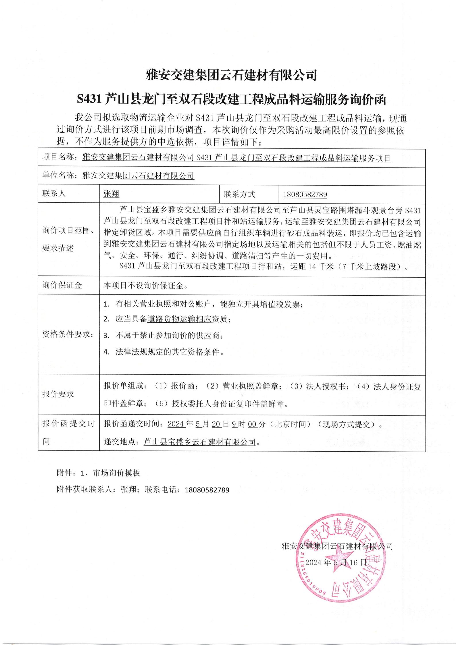 米兰体育-米兰(中国)官网 云石建材有限公司S431芦山县龙门至双石段改建工程成品料运输服务项目询价函