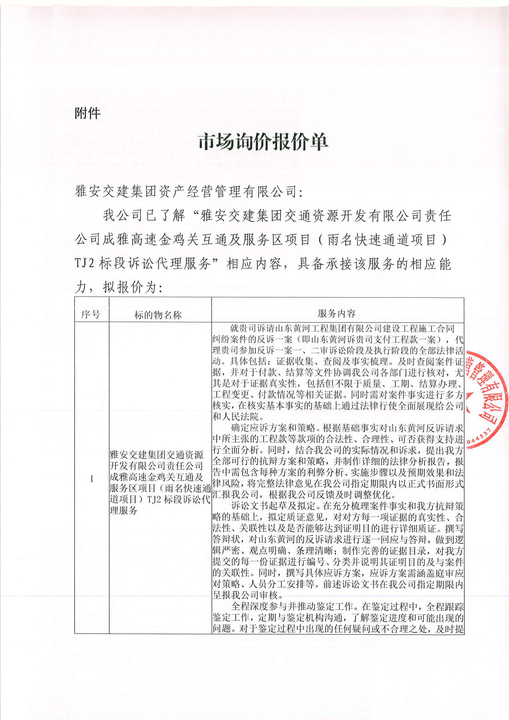 米兰体育-米兰(中国)官网 资产经营管理有限公司成雅高速金鸡关互通及服务区项目(雨名快速通道项目)TJ2标段诉讼代理服务项目市场调查公告