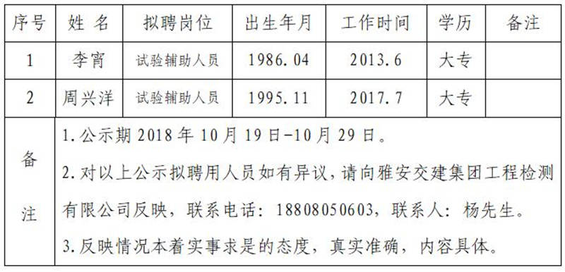 米兰体育-米兰(中国)官网 工程检测有限公司拟聘用人员公示