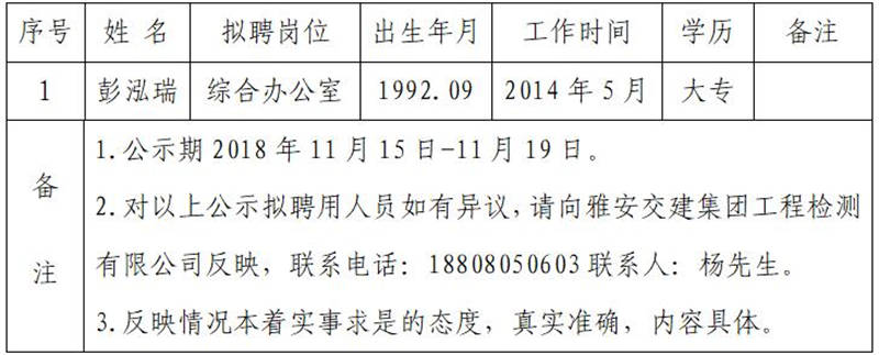 米兰体育-米兰(中国)官网 工程检测有限公司拟聘用人员公示