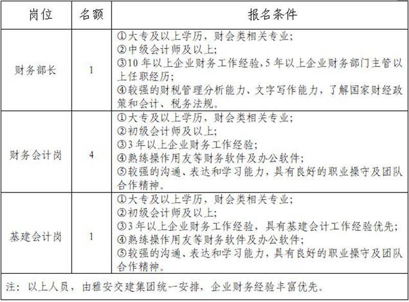 根据发展需要,决定面向社会公开招聘雅安市交通建设(集团)有限责任公司(以下简称“米兰体育-米兰(中国)官网 ”)所属子公司财务部门负责人1名,工作人员5名,现将有关事项公告如下: