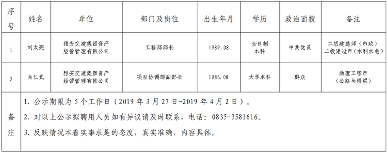 米兰体育-米兰(中国)官网 子公司拟聘用人员公示(资产经营管理公司)
