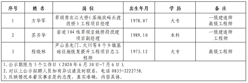 根据四川康藏路桥有限责任公司考察聘任专业技术人才实施方案,经公司研究,现将以下拟聘用人员予以公示: