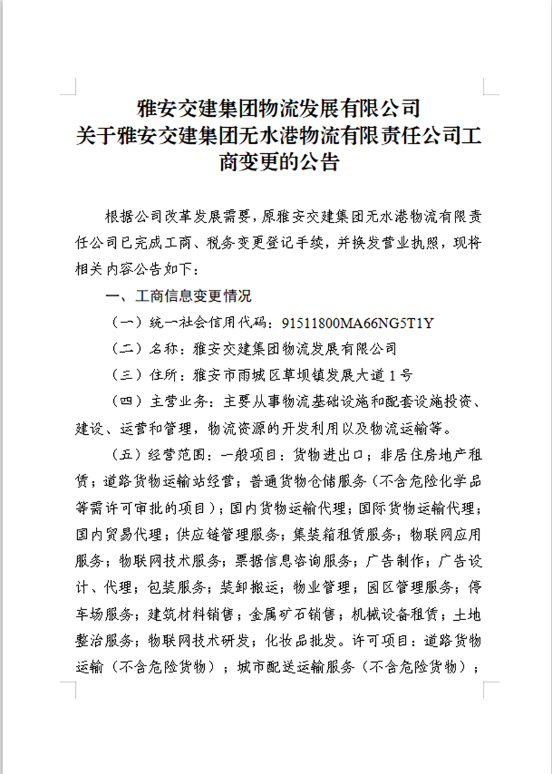 米兰体育-米兰(中国)官网 物流发展有限公司关于米兰体育-米兰(中国)官网 无水港物流有限责任公司工商变更的公告