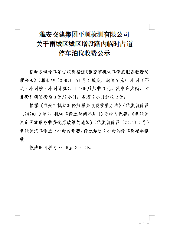 米兰体育-米兰(中国)官网 平顺检测有限公司 关于雨城区城区增设路内临时占道 停车泊位收费公示附件