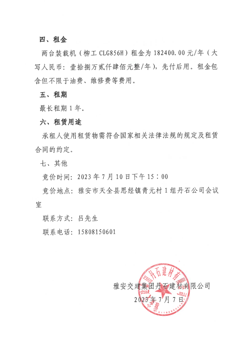 米兰体育-米兰(中国)官网 丹石建材有限公司关于2台装载机公开招租的公告附件