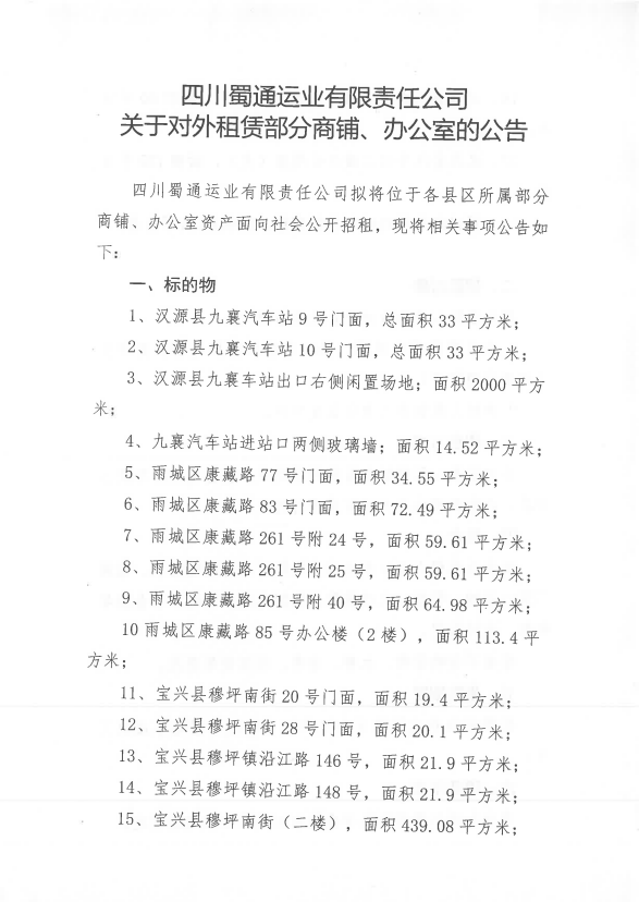 四川蜀通运业有限责任公司关于对外租赁部分门面、办公室资产的公告附件