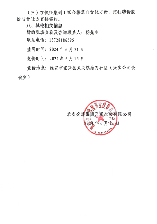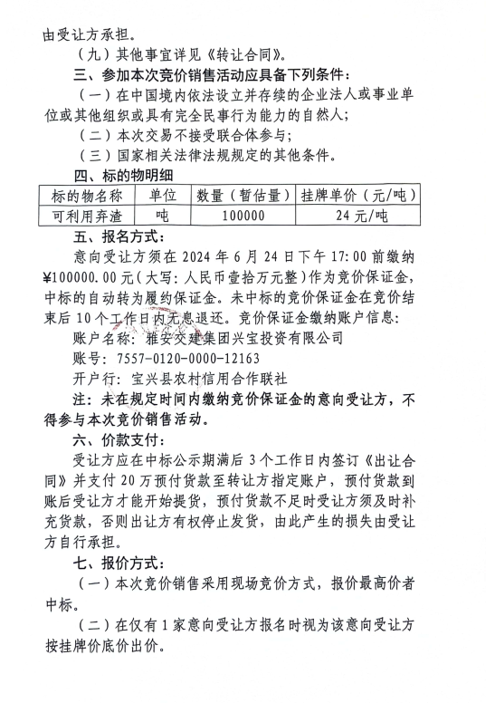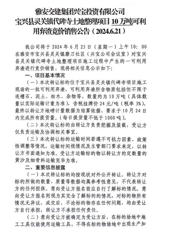 米兰体育-米兰(中国)官网 兴宝投资有限公司宝兴县灵关镇代碑寺土地整理项目10万吨可利用弃渣竞价销售公告(2024.6.21)