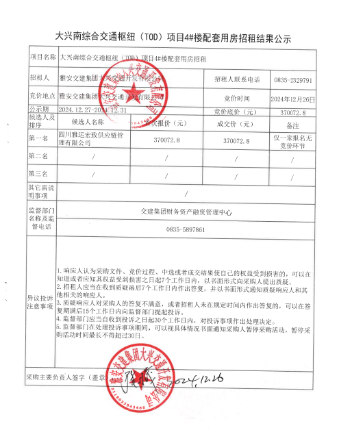 大兴南综合交通枢纽(TOD)项目4#楼配套用房招租结果公示