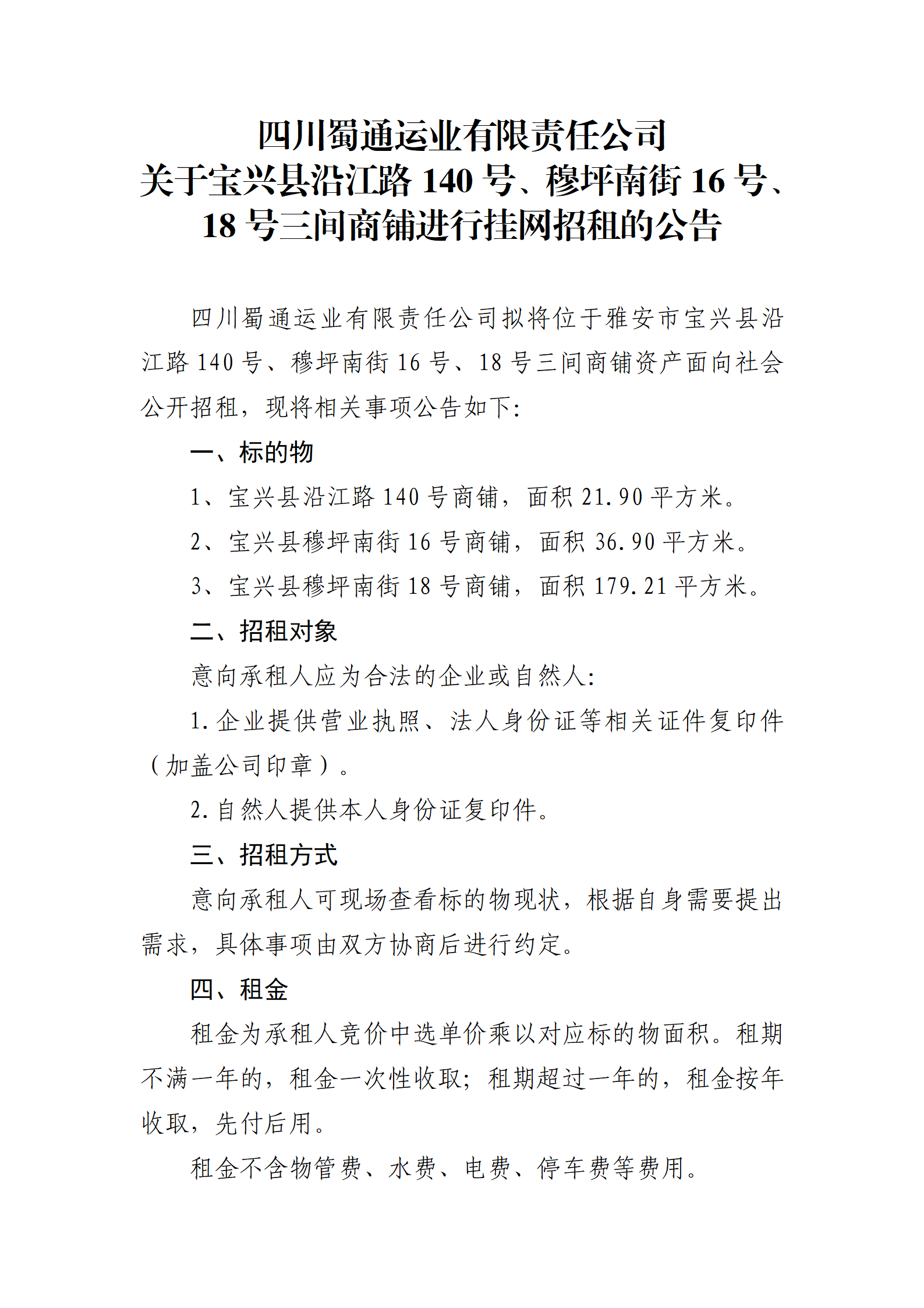 四川蜀通运业有限责任公司 关于宝兴县沿江路140号、穆坪南街16号、18号三间商铺进行挂网招租的公告
