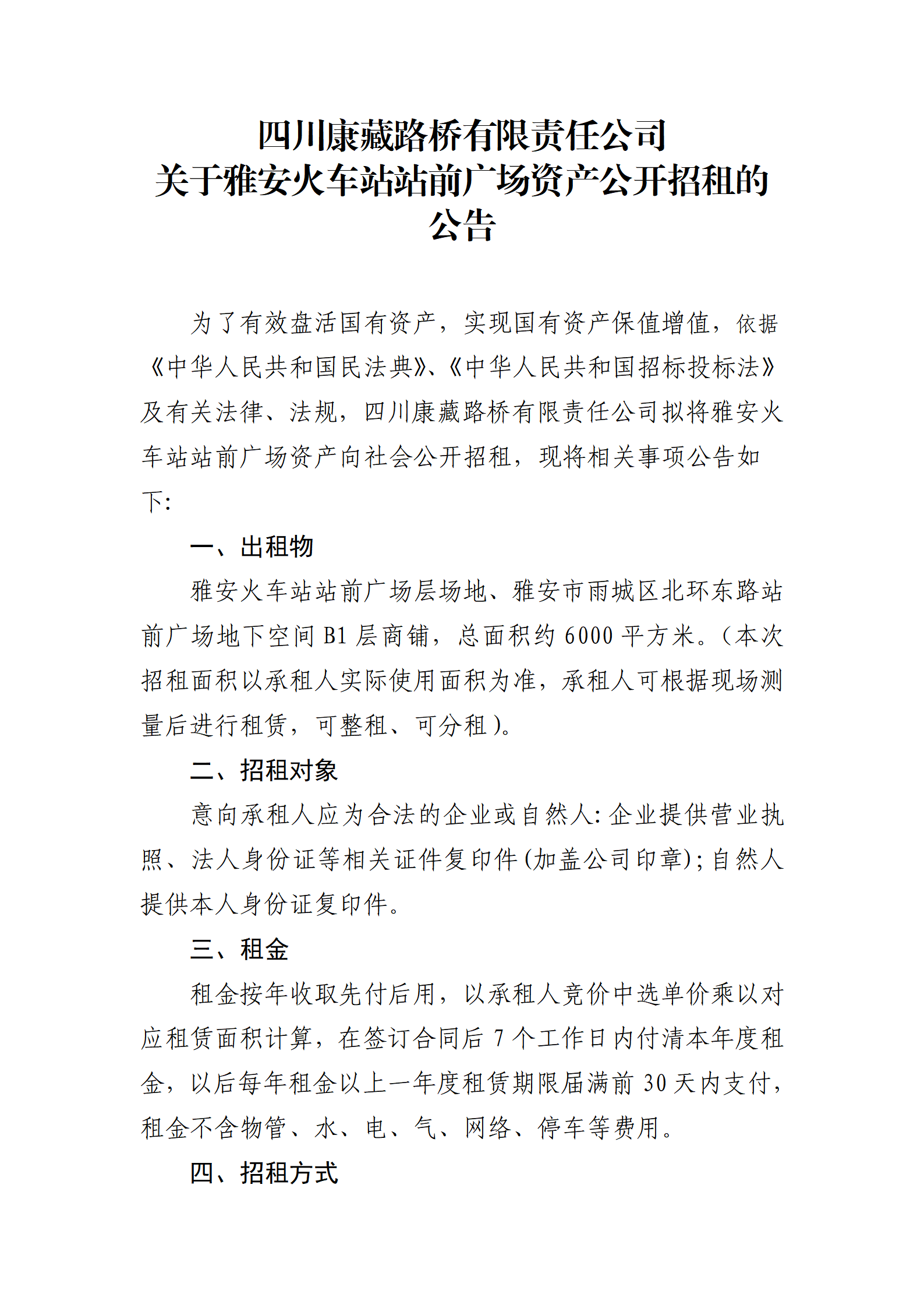 四川康藏路桥有限责任公司站前广场资产招租公告