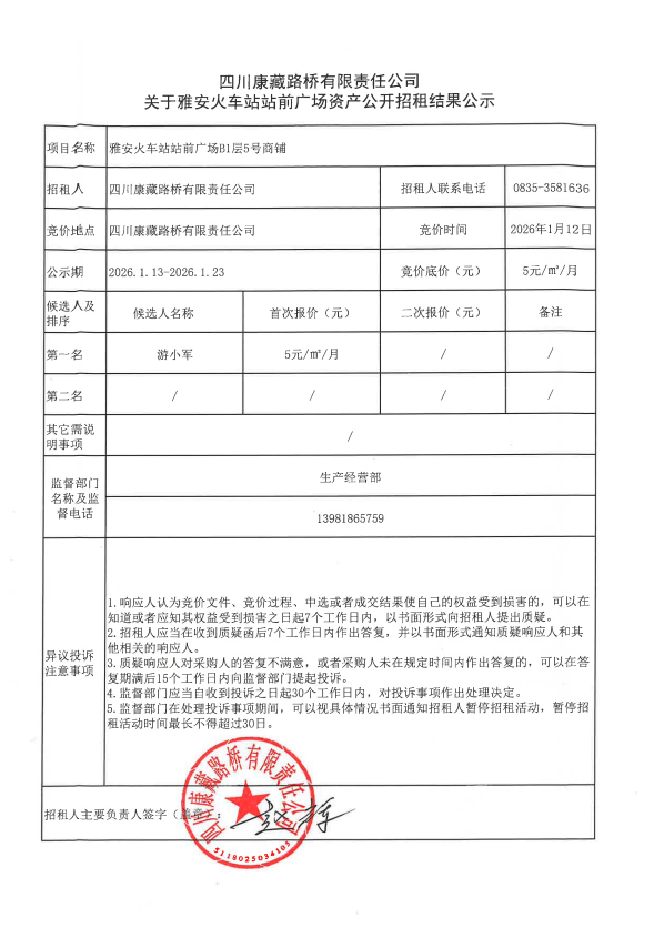 四川康藏路桥有限责任公司关于雅安火车站站前广场资产公开招租结果公示