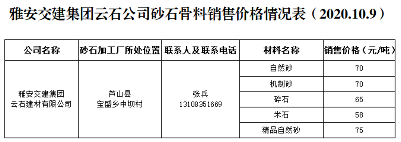 米兰体育-米兰(中国)官网 云石公司砂石骨料销售价格情况表(2020.10.9)