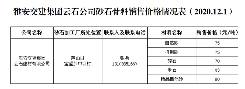 米兰体育-米兰(中国)官网 云石公司砂石骨料销售价格情况表(2020.12.1)