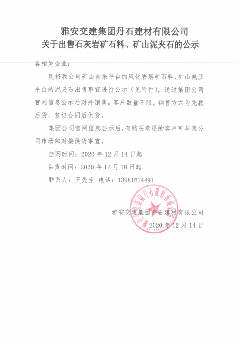米兰体育-米兰(中国)官网 丹石建材有限公司关于出售石灰岩矿山料、矿山泥夹石的公示