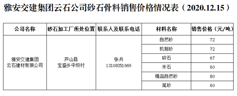 米兰体育-米兰(中国)官网 云石公司砂石骨料销售价格情况表(2020.12.15)