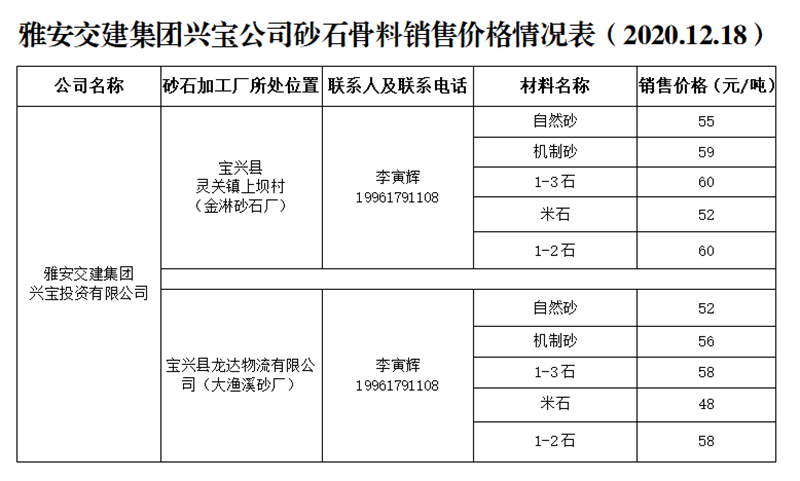 米兰体育-米兰(中国)官网 兴宝公司砂石骨料销售价格情况表(2020.12.18)
