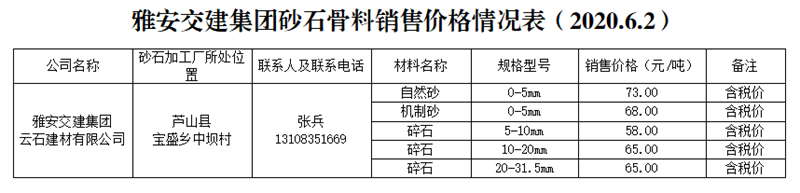 米兰体育-米兰(中国)官网 云石建材砂石骨料销售价格情况表(2020.6.2)