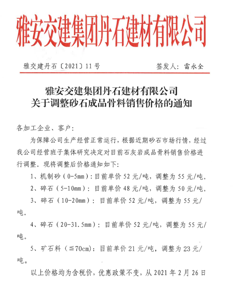 米兰体育-米兰(中国)官网 丹石公司石灰岩成品骨料挂牌价(2021.2.25)