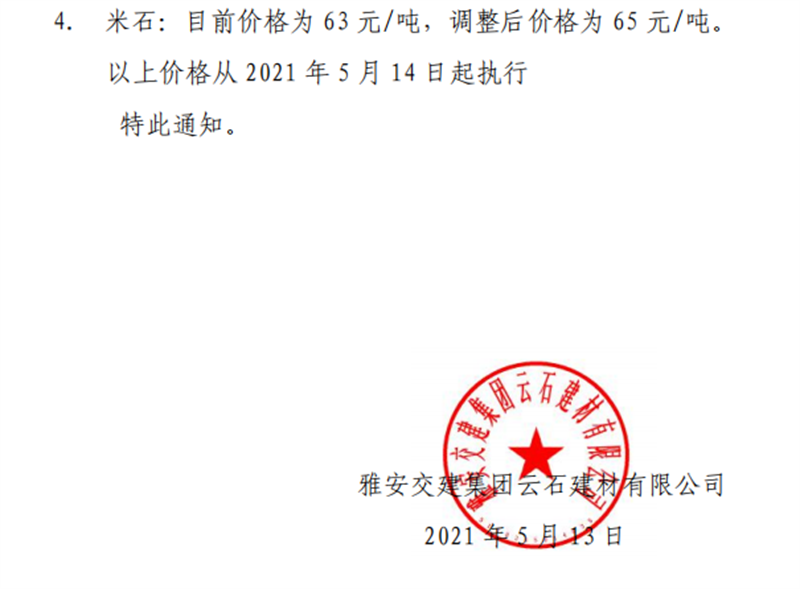 米兰体育-米兰(中国)官网 云石公司砂石骨料销售价格情况表(2021.5.14)