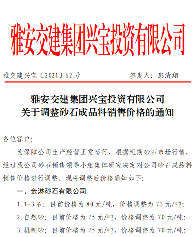 米兰体育-米兰(中国)官网 兴宝公司关于调整砂石成品料销售价格的通知(2021.9.28)
