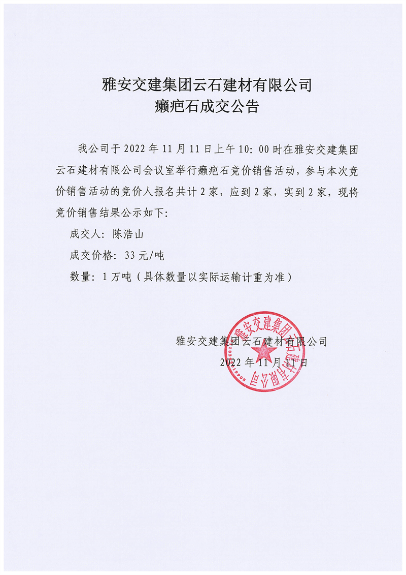 米兰体育-米兰(中国)官网 云石建材有限公司癞疤石成交公告11.11