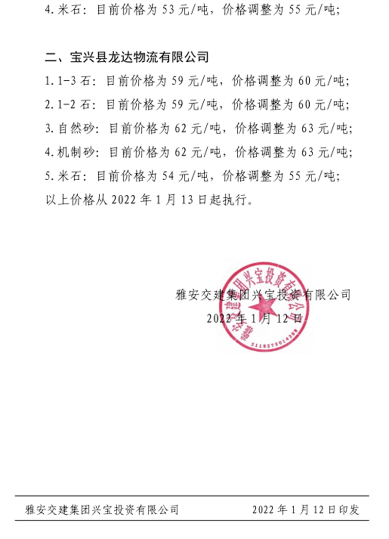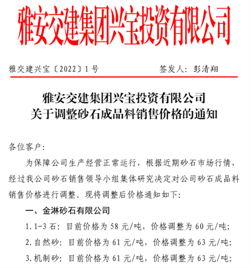 米兰体育-米兰(中国)官网 丹石公司关于调整砂石成品骨料销售价格的通知(2022.1.5)